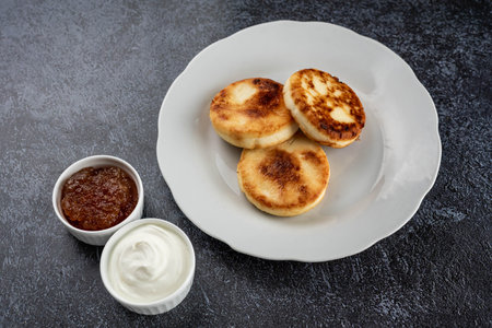 Cottage cheese pancakes on stone background. Syrniki with sour cream. Homemade food