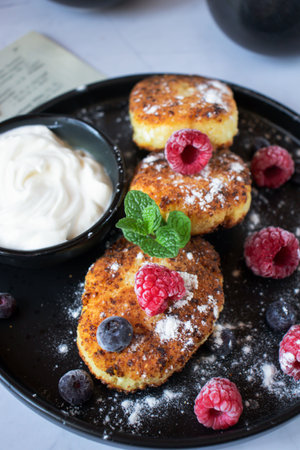 Syrniki or syrniki with cottage cheese and currant berries. Healthy breakfast concept. Delicious dessert or sweet breakfast.