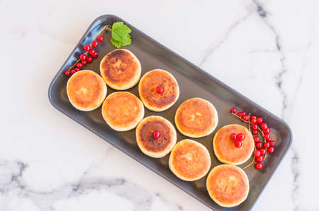 Cottage cheese pancakes, ricotta fritters or syrniki with currant. Healthy and delicious morning breakfast.