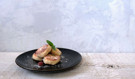 Cottage cheese fritters on ceramic plate on concrete background. Healthy calcium breakfast, lunch or snack. traditional russian food. close up