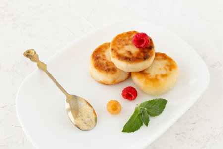 Homemade curd fritters with raspberries, a teaspoon and mint leaves on the white porcelain plate.
