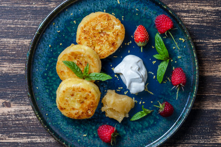 Fresh cottage cheese or ricotta pancakes (syrniki, fritters) on a blue plate with fresh berries and jam. Delicious healthy cottage cheese breakfast. Ukrainian, Russian cuisine sweet food