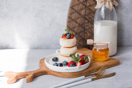 Cottage cheese pancakes, Russian cheesecakes with fresh blueberries, strawberries, honey and mint leaves on a stylish wooden board on a gray concrete table. natural products. Healthy and delicious breakfast.