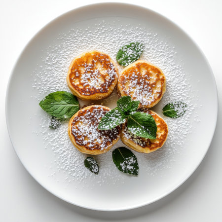Golden-crusted pancakes served on a white plate with berry sauce and fresh mint create a warm and cozy atmosphere for breakfast or dessert, perfect for cafes and home cooking.