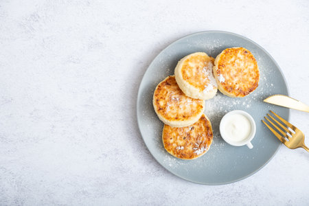 Fried cheesecakes on a plate with sour cream and powdered sugar top view. Ukrainian food