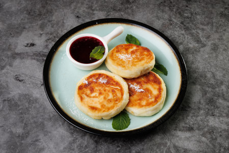 Delicious fried cheesecakes with a crispy crust, poured with cherry jam, served on a gray ceramic plate with a ball of sour cream and decorated with a sprig of fragrant mint