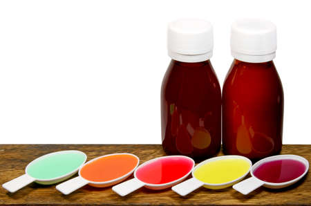 Syrup Medication Bottles and Medicine Spoons Isolated on White Background.