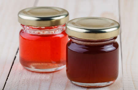 two jars of jam on a wooden background