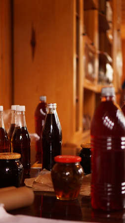 Homemade mead bottles on the shelf of an outdoor market. honey wine. homemade wine in georgia