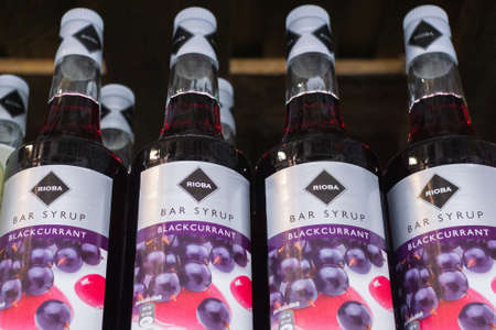 Tyumen, Russia - avg 25, 2019: Products of hypermarket sale syrup Rioba beverages in the metro store cash and carry