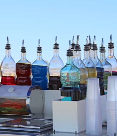 many bottles of juices and syrups at the seaside bar in summer