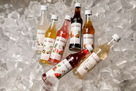 UKRAINE, KYIV - DECEMBER 06, 2021: close-up top view of bottles of Monin syrups lying on ice cubes