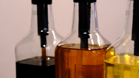 Original glass bottles with different vinegar on a marble table against a background of a white brick wall. Copy space.