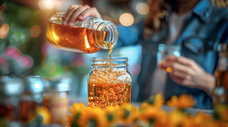 Woman Pouring Honey Surrounded by Vibrant Flowers