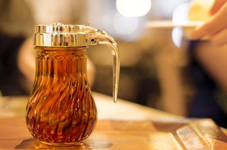 Hand pouring a rich stream of golden maple syrup from a glass bottle into a small jar on a wooden table, with soft bokeh lights.
