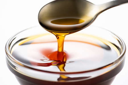 Thick syrup pours gracefully from a bottle, glistening as it drizzles onto a glass spoon in a bright, inviting atmosphere.