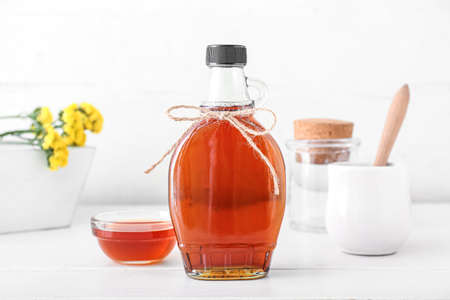 Glass bottle of maple syrup surrounded by autumn leaves and pinecones on a wooden table Warm cozy fall atmosphere with natural colors