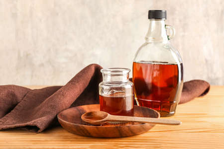 Bottles and bowl of tasty maple syrup on wooden table, space for text