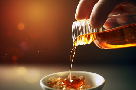 Sticky bottle of vanillextract being poured into measuring spoon , Professional stock photo, AI generated photograph