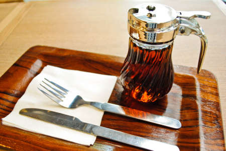 A small glass bottle filled with golden maple syrup, perfect for breakfast or baking.