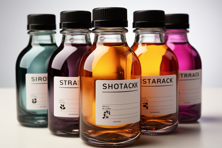 Scientific experiment in a row, illuminated equipment reflects multi colored liquid generated by artificial intelligence