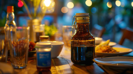 A Thai fish sauce dispenser, or nam pla, placed on a dining table for seasoning dishes to taste.