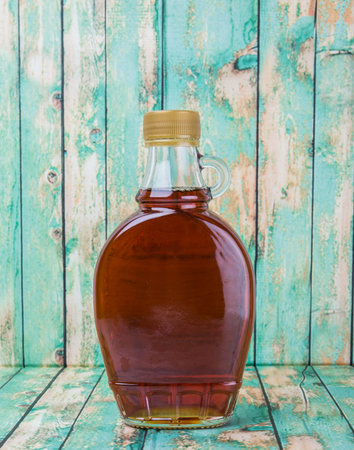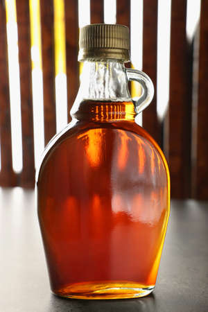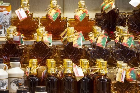 MONTREAL, CANADA - NOVEMBER 3, 2018: Maple Syrup bottles for sale on Montreal Jean Talon market. Quebec is the highest producer of Maple syrup in the world, and the symbol of Canada