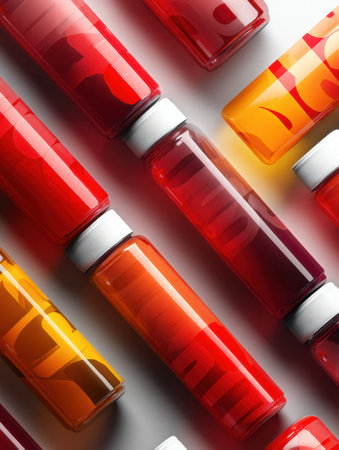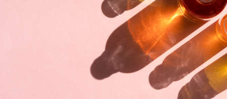 Different cosmetic glass bottles standing on beige background. Abstract pattern by shadows and illuminating reflections in the sunlight. Red, green and yellow shades. Flat lay style with copy space