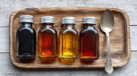 healthcare, treatment bottle of medication or antipyretic syrup and spoon. Medications in glass bottles. Medical concept. Close up on a black background. copy space for text, selective focus. smart tv