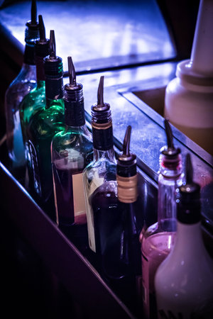 Front view on row of bottles with alcoholic drinks on bar counter.