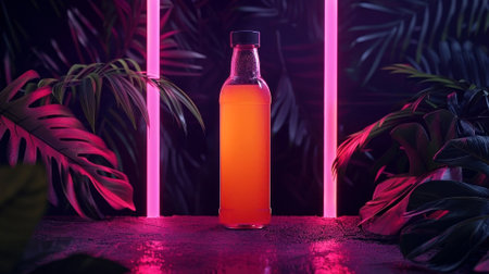 Vape concept. Smoke clouds and vape liquid bottles on dark background. Light effects. Useful as background or vape advertisement or vape background. Selective focus