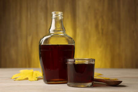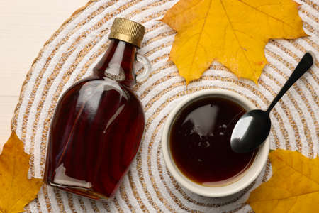 Flat lay composition of tasty maple syrup and dry leaves on white wooden table