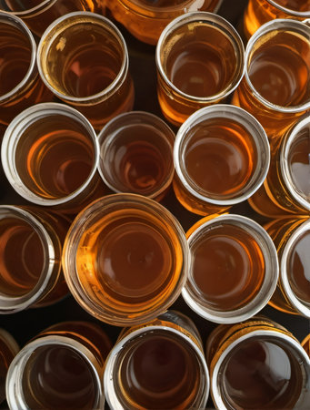 Different beers filling bottles, close up. Beer taps in action, close up.