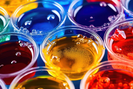 Close up view of set of clinical samples of red liquid in round plastic containers on a white surface