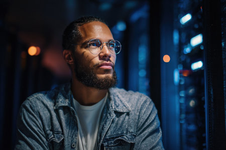 Young Man Working in a Technology Lab Surrounded by Servers and Bright Lights in an Urban Setting During Evening Hours. Generative AI