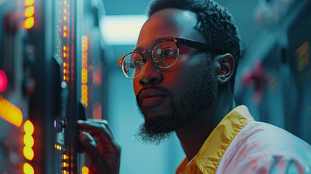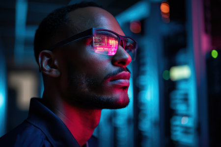 A man wearing reflective glasses stands among illuminated servers, focused on a bright screen visible in the lens reflection. The scene captures a technological atmosphere with vibrant lighting