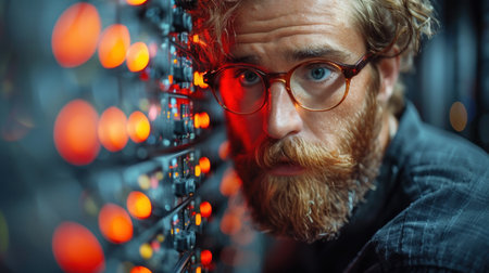 A young man with glasses and a beard working in a data center, using a tablet. Bright red server lights reflect on his focused expression.
