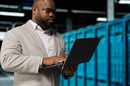 Side view portrait of African American data engineer holding laptop while working with supercomputer in server room lit by blue light, copy space