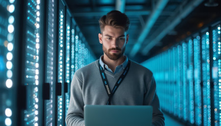 A young man with a well-groomed beard is intently working on a laptop amidst rows of glowing server racks. The image captures the essence of modern technology and dedication, highlighting the critical role of IT professionals in managing complex systems.