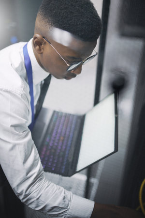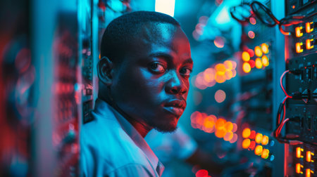 Graphic portrait of African American man working as IT engineer and setting up network in server room, copy space