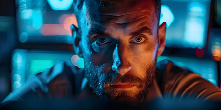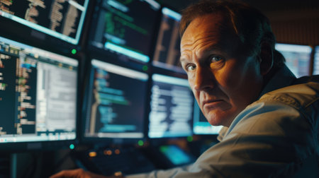 A man keeps watch over network activity to prevent cyber threats. Concept Network Security, Cyber Threats, Data Protection, Surveillance Monitoring, Internet Safety