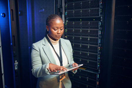 Let me test the speed. a young woman using a digital tablet while working in a server room.