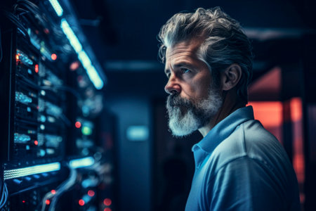 Portrait of senior technician looking around modern server hub in data center, preparing to start comission on malfunctioning high tech workplace hardware racks in order to ensure flawless operations