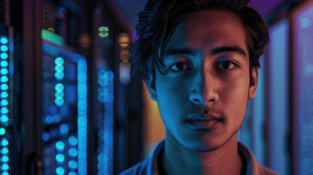 The close up picture of the IT specialist man from south asia is looking at camera and working in the server room, the IT specialist require skill like technology knowledge and data analysis. AIG43.tt