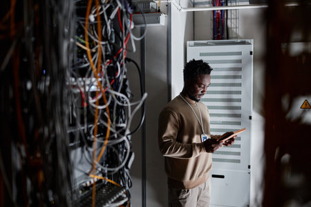 Moody wide angle shot of black man as system administrator standing in server room and holding tablet, copy space