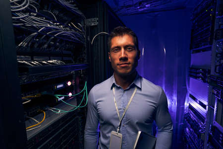 Portrait of male technician or network administrator standing brave as a hero with arms crossed in data center server room.