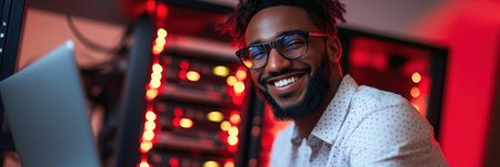 Happy African American Man in a Server Room. African American in a Server Room: Joy and Technology.