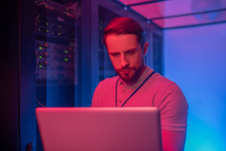 Administration. Focused smart young man with laptop standing near the server looking closely at monitor