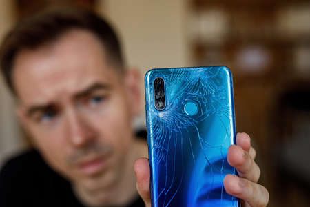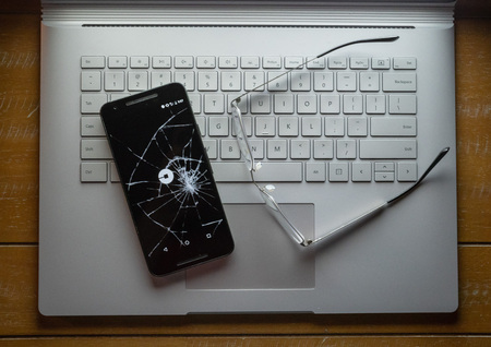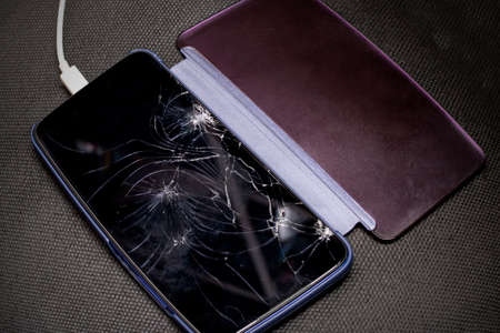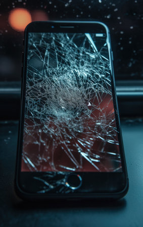 A smartphone, mobile phone with a cracked screen, psychological thriller feeling, cinematic lighting. Generative AI