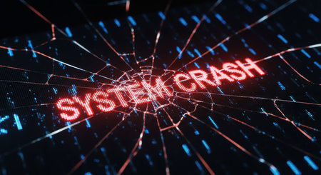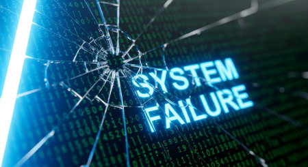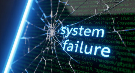 A futuristic digital interface displaying a system failure alert, with technical text and error messages. The glowing red and blue text on a dark background creates a high-tech and urgent aesthetic, symbolizing cybersecurity issues or technological malfunctions.
